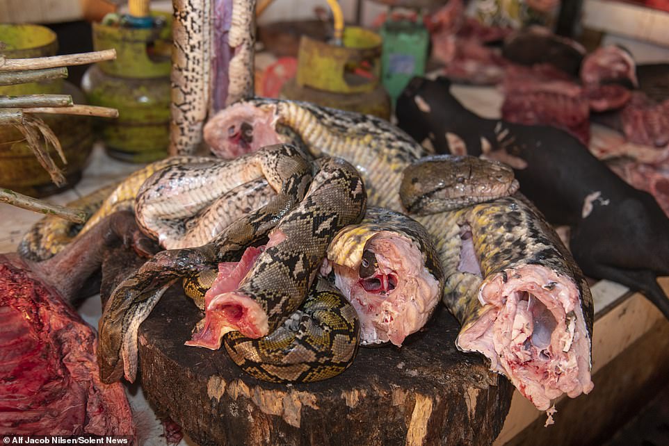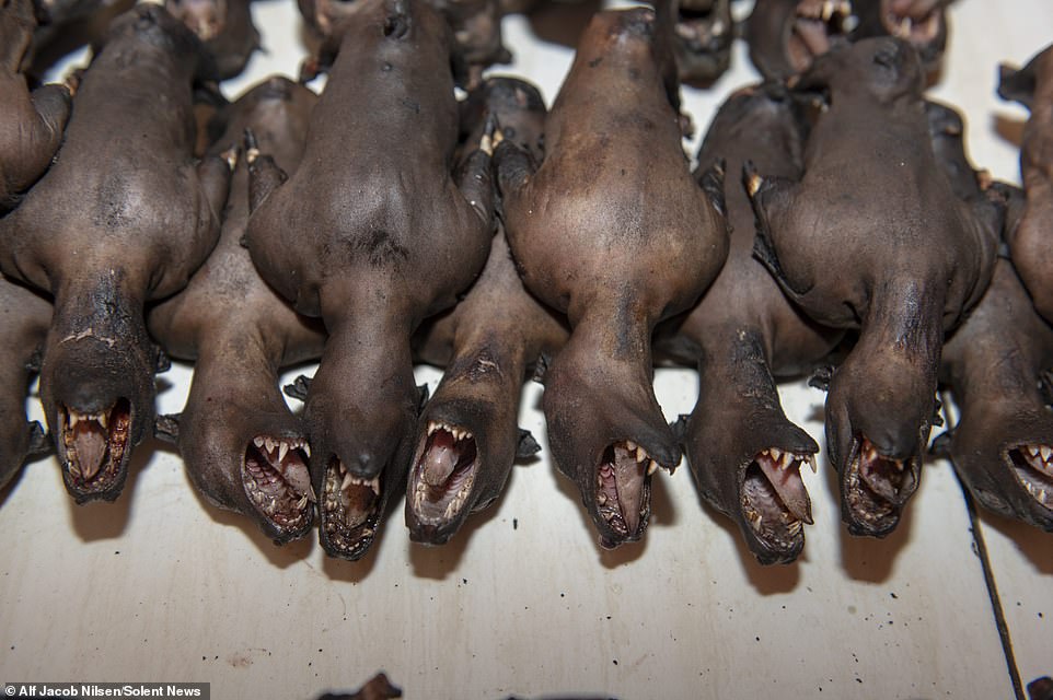 Трупы убитых летучих мышей на прилавках рынка Томохон