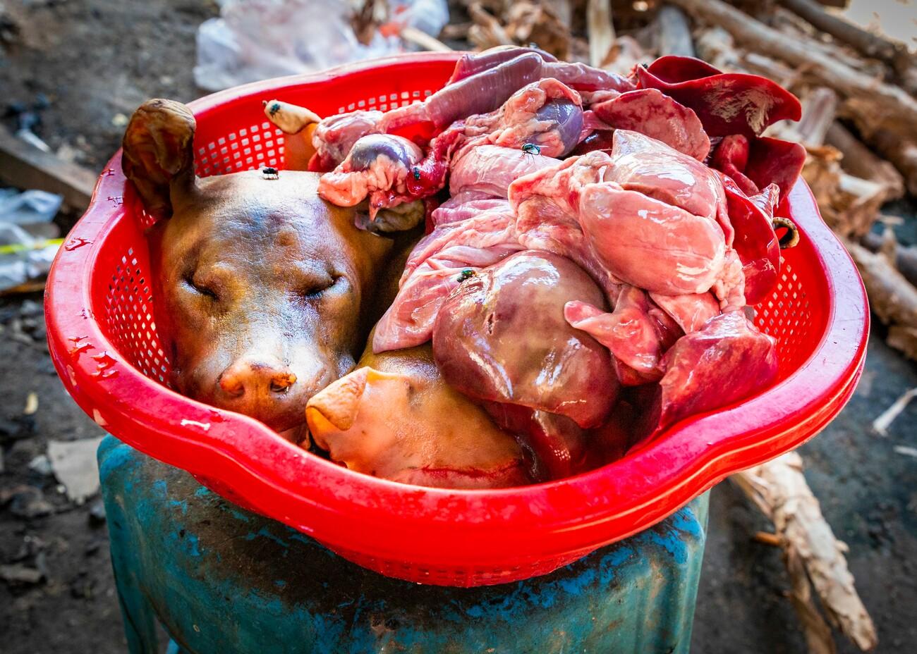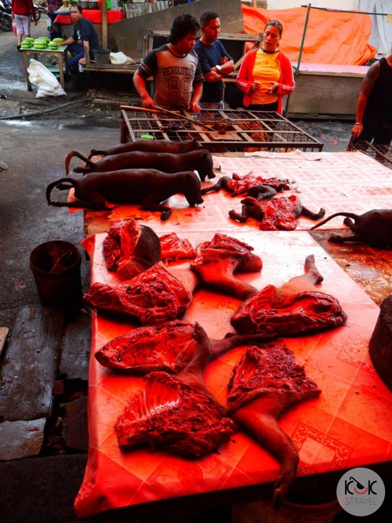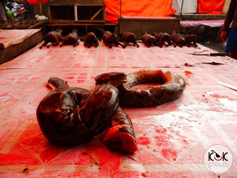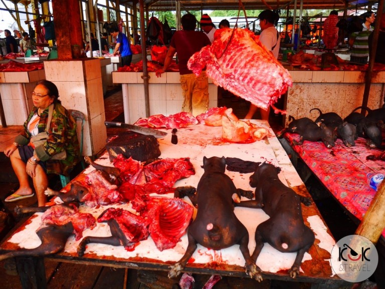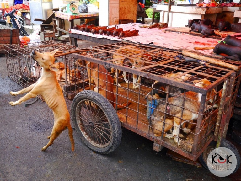 Помимо стандартной еды на любом местном рынке, такой как: овощи, фрукты, рыба, вы также увидите собаку, кота, обезьяну или мясо летучей мыши. На прилавках будут крысы, питоны и вам попадутся запертые в клетках кошки и собаки, которые через несколько часов пойдут на жестокий убой… и происходит это там на рынке на глазах у других людей и маленьких детей, как будто в этом нет ничего экстраординарного и жестокого.