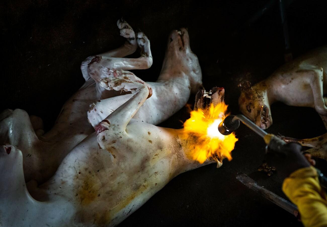 Осознав свою судьбу, животные кричат от ужаса, прежде чем их вытаскивают из клеток и окунают в резервуары с помойной водой. Вода пузырится и бурлит, а собаки тщетно борются за жизнь. Наконец, собака замирает…. А затем процесс повторяется, клетка за клеткой, день за днем, год за годом.