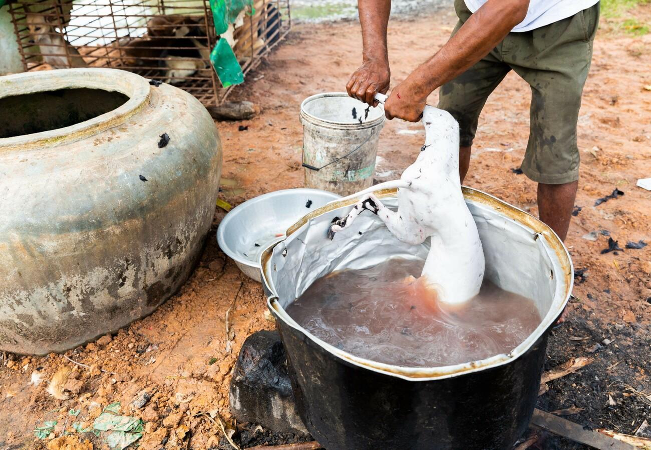 Перед продажей в рестораны с животного необходимо снять шерсть. Для этого собак и кошек окунают в кипяток (некоторых еще живыми) и сдирают шерсть либо руками мясника, либо ножом. Кошек можно либо варить, либо помещать в машину для удаления оперения с птицы. В других случаях для выжигания волос на теле обычно используется паяльная лампа. После удаления меха животных готовят к употреблению в пищу.
